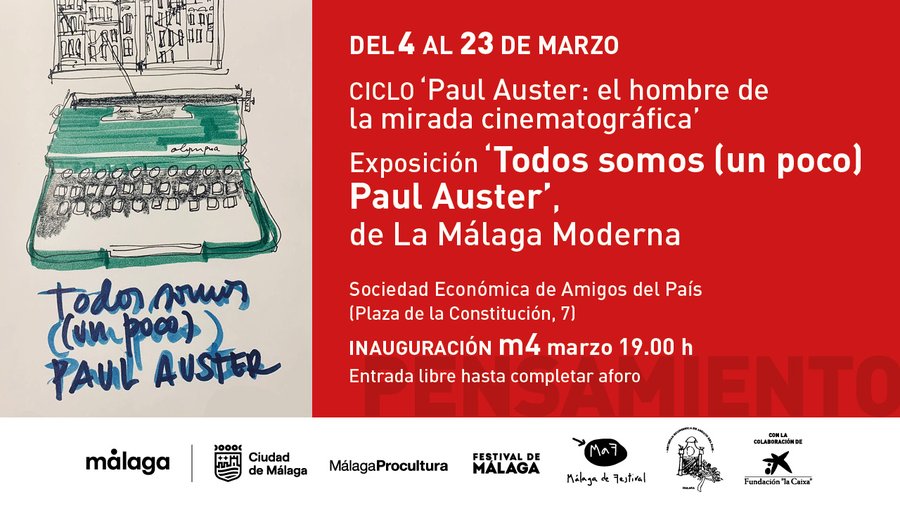Sala B: Exposición Todos somos (un poco) Paul Auster, de La Málaga Moderna. Cartel