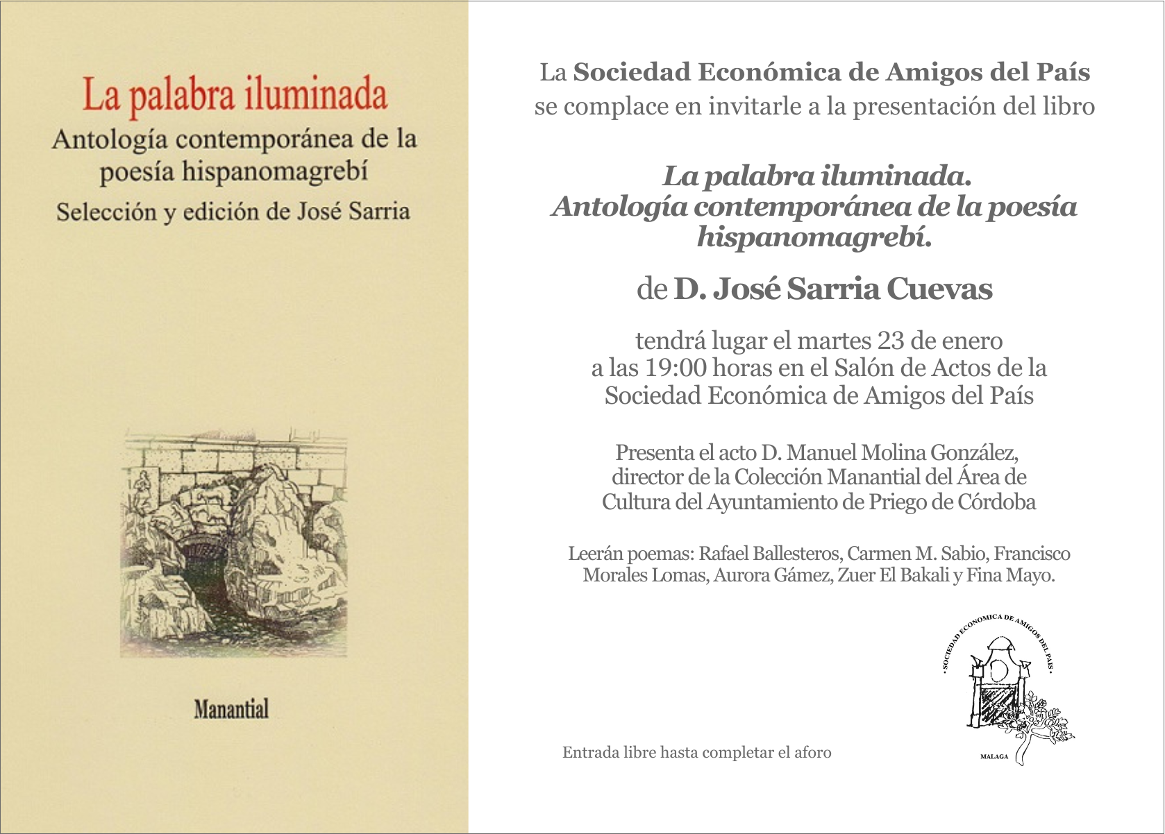 “LA PALABRA ILUMINADA. Antología contemporánea de la poesía hispanomagrebí” es la última obra de José Sarria que ha sido editada por el AULA DE LITERATURA del Ayuntamiento de Priego de Córdoba (Córdoba), en su colección MANANTIAL que dirige Manuel Molina González. La obra recoge una amplia y exhaustiva introducción explicativa acerca de la génesis y desarrollo de la poesía hispanomagrebí: aquella que desarrollan autores de origen marroquí y tunecino que usan como lengua vehicular (sin traducción) la lengua de Cervantes.