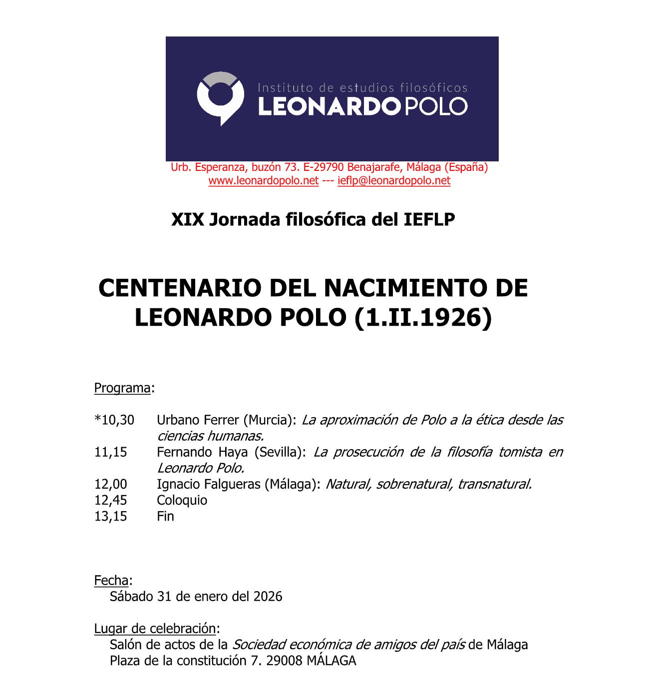XIX JORNADA FILOSÓFICA DEL IEFLP. Centenario del nacimiento de Leonardo Polo (1.II.1926)
