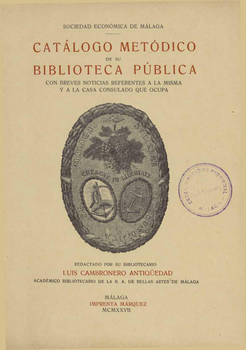 Catálogo metódico del fondo histórico de la Biblioteca de la Económica, publicado en 1927 y realizado por el bibliotecario-archivero Luis Cambronero Antigüedad (en la Biblioteca Virtual de Málaga). Una foto fija; desde esta pieza digital puede consultarse la distribución original de los ejemplares de la biblioteca en 1927, ordenados por materias, lo que ofrece una valiosísima visión histórica de su colección.