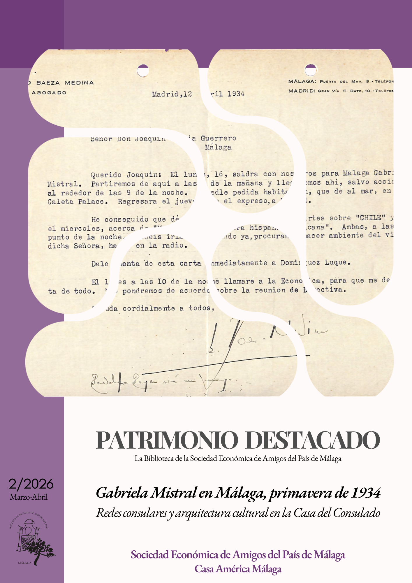 Este número de Patrimonio Destacado reconstruye, a partir de la documentación original conservada en el archivo de la Sociedad Económica, la visita de Gabriela Mistral a Málaga en 1934. Más que un acontecimiento literario, su paso por la Casa del Consulado revela las redes culturales e institucionales que articularon un diálogo transatlántico en la España de la Segunda República.