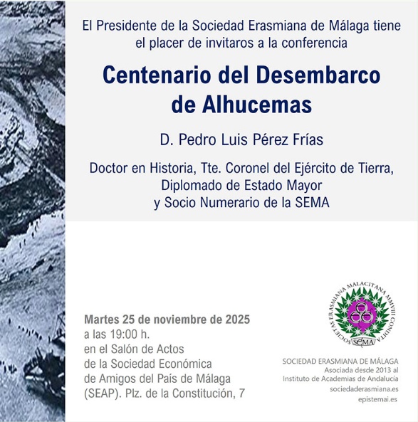 Centenario del desembarco de Alhucemas, a cargo de D. Pedro Luis Pérez Frías, Doctor en Historia, Teniente Coronel del Ejercito de Tierra y socio numerario de la Sociedad Erasmiana de Málaga.